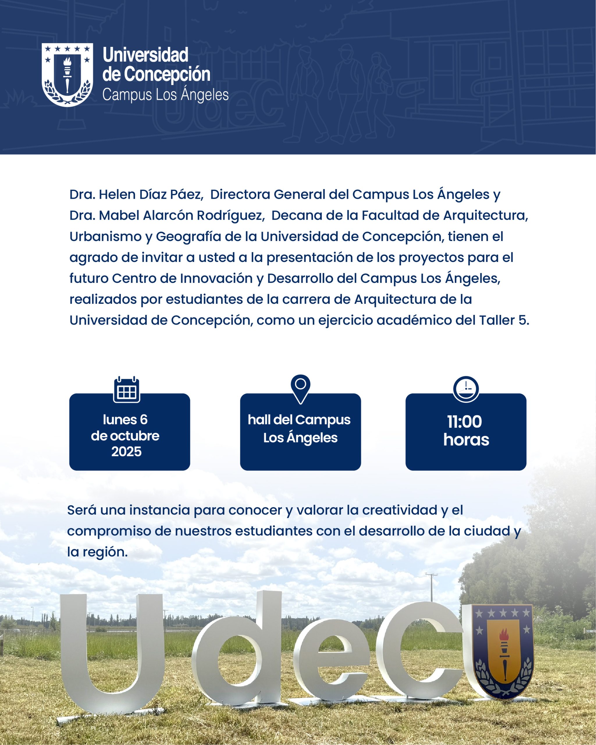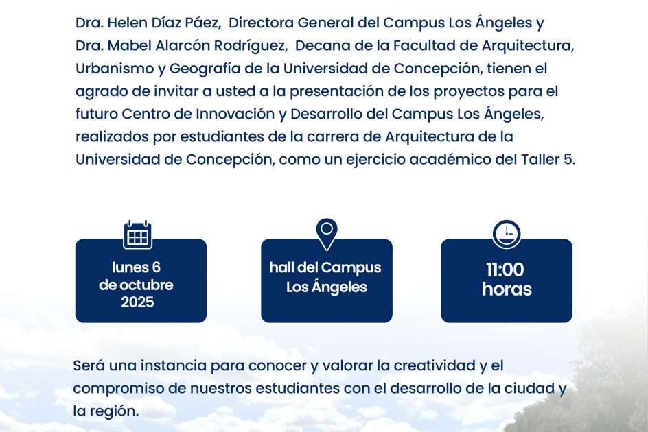 Dra. Helen Díaz Páez, Directora General del Campus Los Ángeles y Dra. Mabel Alarcón Rodríguez, Decana de la Facultad de Arquitectura, Urbanismo y Geografía de la Universidad de Concepción, tienen el agrado de invitar a usted a la presentación de los proyectos para el futuro Centro de Innovación y Desarrollo del Campus Los Ángeles, realizados por estudiantes de la carrera de Arquitectura de la