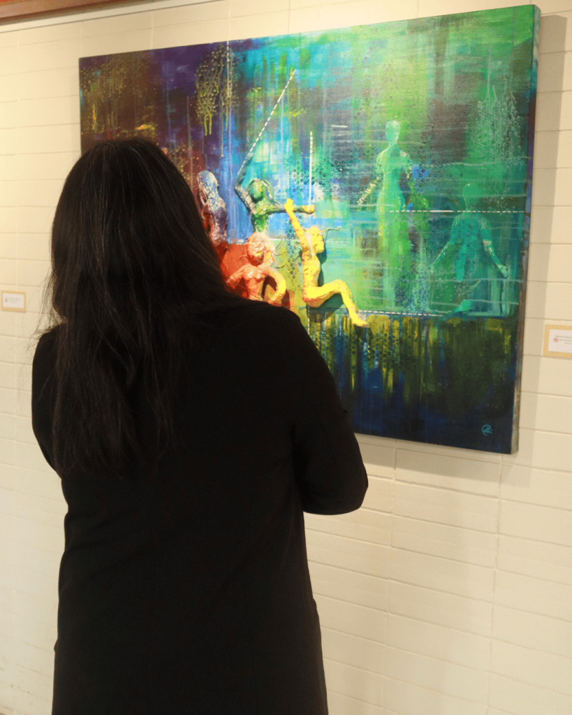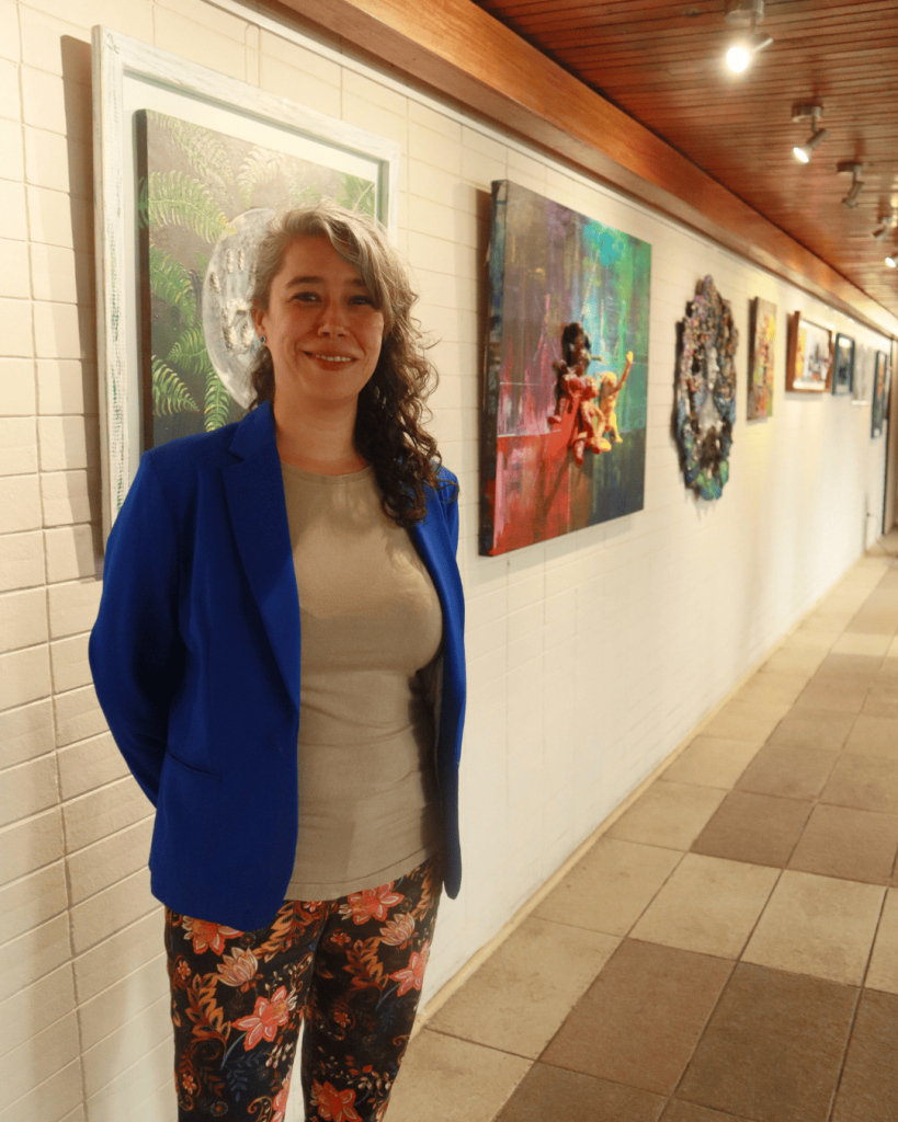 La primera muestra, ubicada en el hall principal del Campus Los Ángeles, expresa la invitación de la artista Gabriela Riquelme Borgeaud. Con una licenciatura en artes, mención en pinturas de la Universidad de Concepción, se ha dedicado hace más de 15 años a la docencia en colegios.