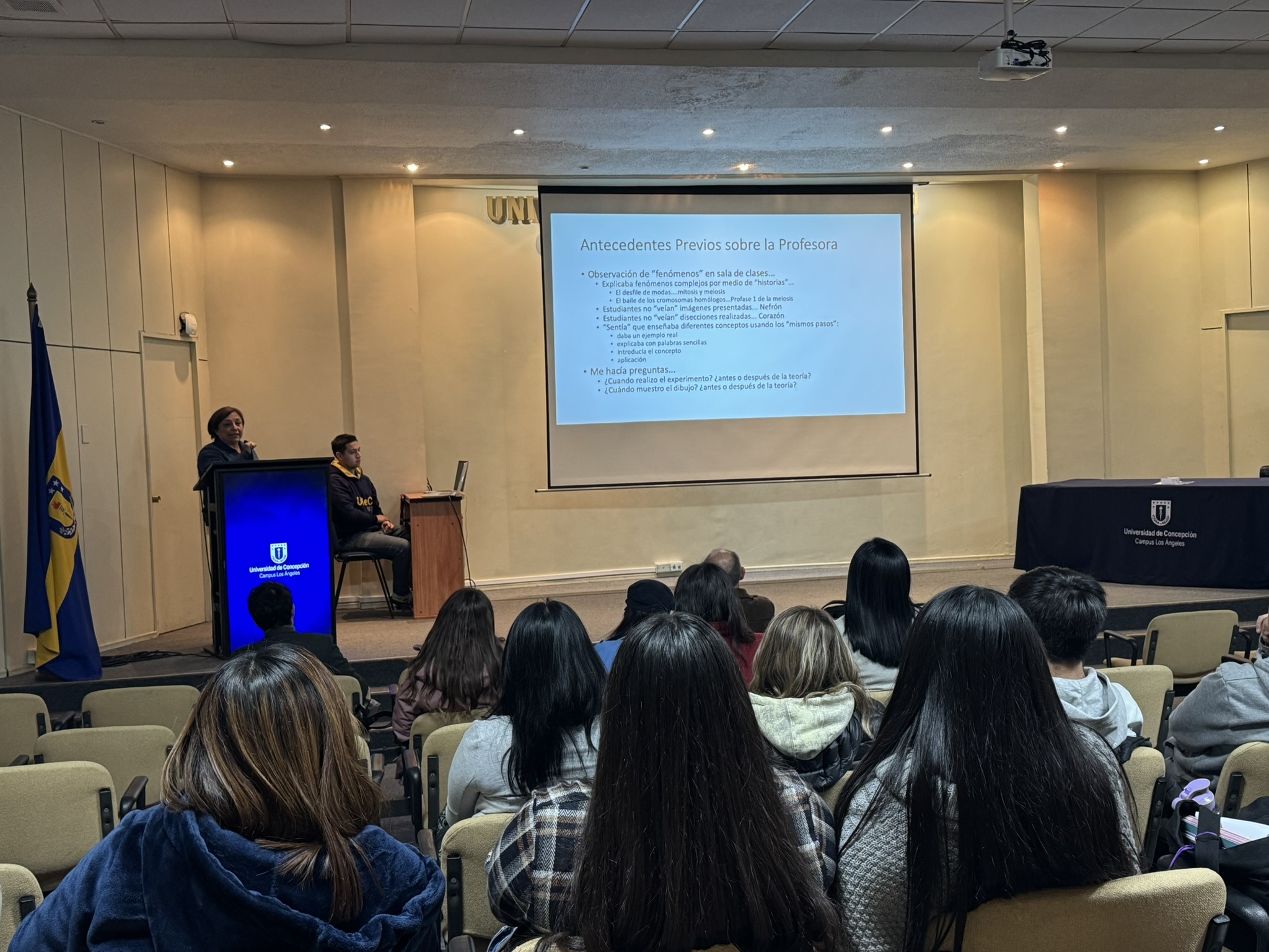 Durante su presentación, la Dra. Núñez, profesora de Biología y Química formada en la UdeC y exalumna del Campus Los Ángeles, compartió su experiencia investigativa y pedagógica en torno a la construcción de modelos mentales en el aprendizaje de las ciencias. Con un enfoque práctico y narrativo, abordó cómo se desarrolla el razonamiento científico tanto en investigadores como en estudiantes, y cómo la enseñanza puede activarlo eficazmente a través de analogías, simulaciones mentales y estrategias cognitivas como el conflicto o la disonancia cognitiva.